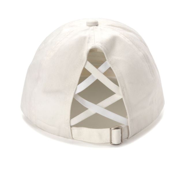Material: 100% cotton hat with elastic criss-cross straps that allow you to wear your ponytail at different heights and an adjustable buckle