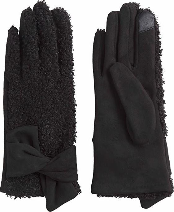 These sherpa gloves feature faux suede palms and bow at wrist.
