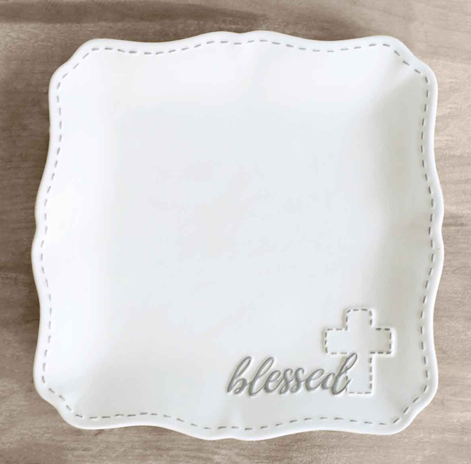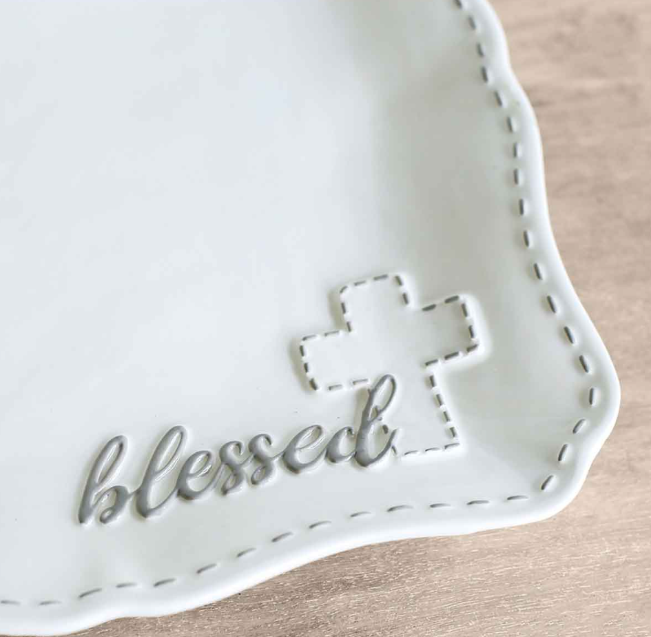 A beautiful white, square platter with the word 'blessed' scripted in the bottom right hand corner. The platter also features a gray cross and a gray border along the outside.