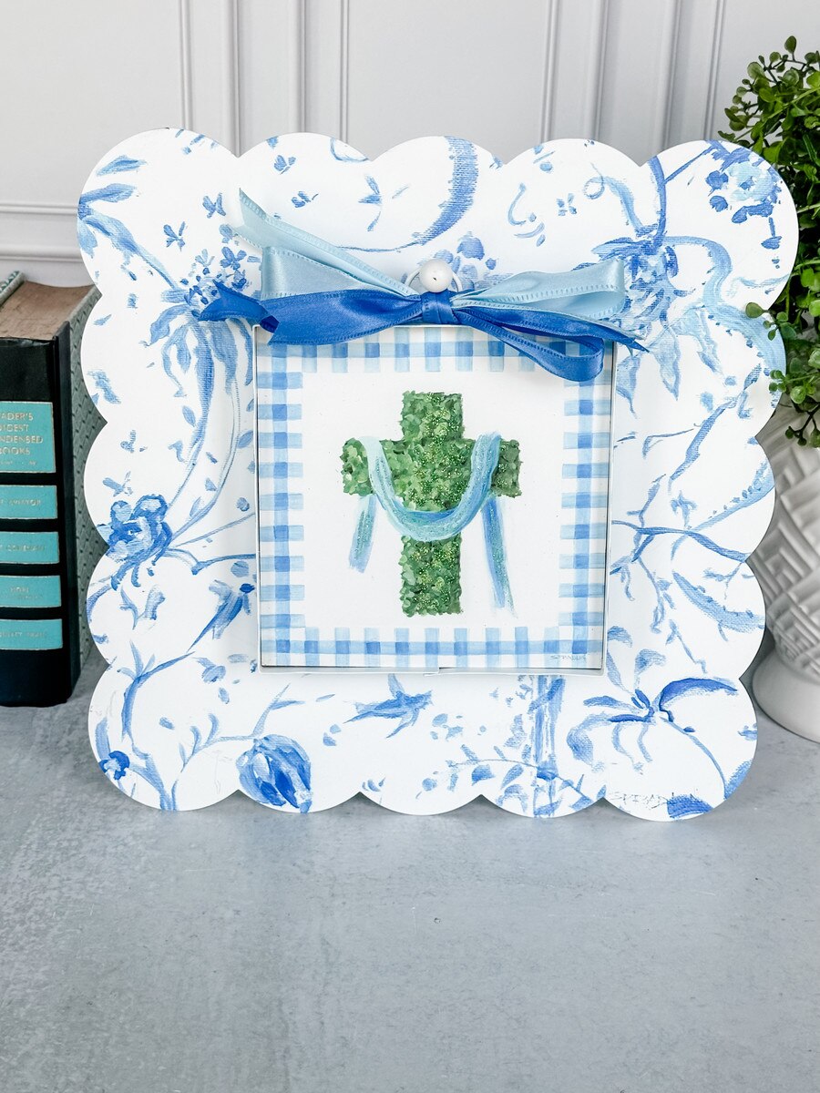 Bring a touch of elegance to any space with this charming mini gallery decor piece! Featuring a beautifully crafted boxwood topiary cross adorned with a delicate blue sash, it's the perfect accent for shelves, desks, or nightstands. This sweet little treasure adds a pop of botanical charm and cheerful color to your home décor. Whether you're decorating for the season or looking for a year-round statement piece, this darling cross is sure to brighten your day and spark joy in any room!