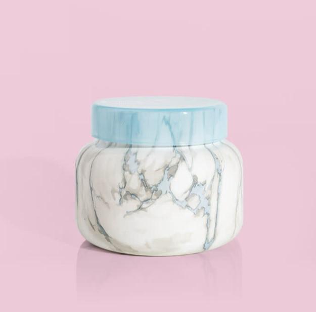 Say hello to your home's new focal point! This Modern Marble signature jar features an eye-catching design paired with our comforting Blue Jean fragrance. Finished with a pop of sky blue, this candle will complement any room.