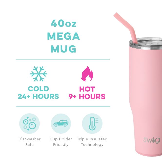 Hydrating has never been easier with our 40oz Mega Mug! The cup holder friendly frame, comfort-grip handle and flexi-straw come together to create their new favorite Swig!