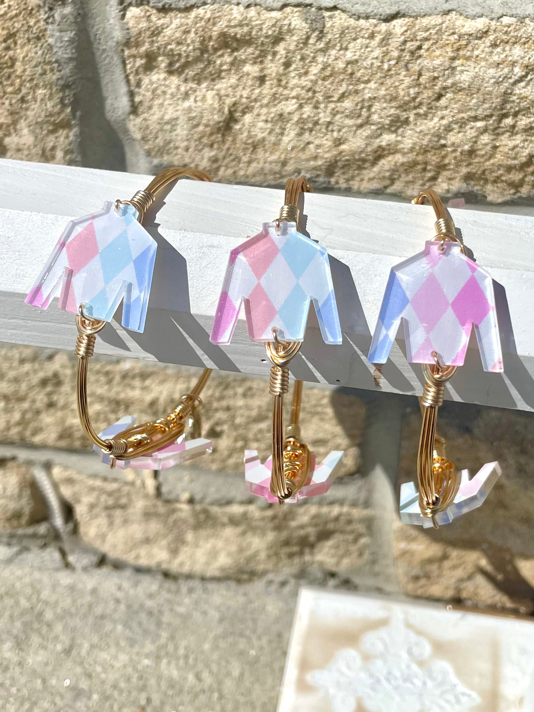 Gold plated copper wire-wrapped bangle adorned with three Acrylic Silks. Stones may vary in size, shape or color.