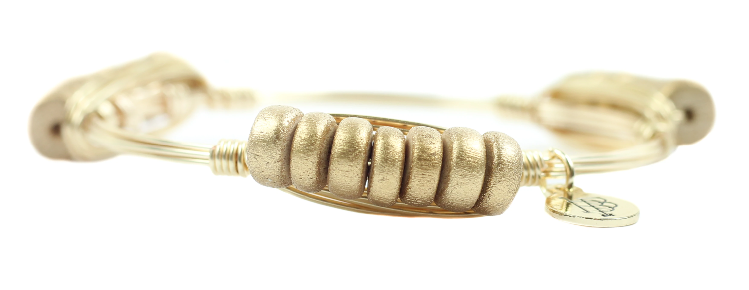 Gold plated copper wire-wrapped bangle adorned with three clusters of gold cheesewood pieces. Stones may vary in size, shape or color.