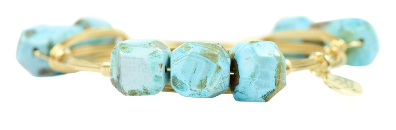 Gold plated copper wire-wrapped bangle adorned with three clusters of stones. Stones may vary in size, shape or color.