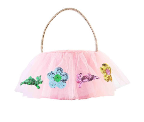 Felt Easter basket features sequin tulle tutu skirt overlay and shimmer fabric handle. Ages 3+.