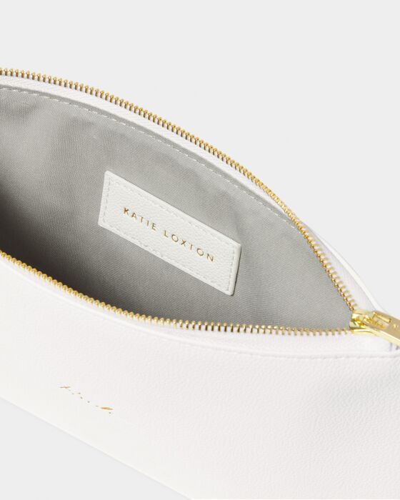 Our Bridal Sentiment Pouch in White is the ideal accessory for big-day celebrations. Carefully designed with soft vegan leather, this pouch adds a touch of elegance to every wedding guest's attire as they toast to the couple's happily ever after. Adorned with the gleaming stamped sentiment 'Bride', it's a charming reminder of their contribution to the big day. The zip-top closure ensures essentials are securely tucked away, while the lightweight design guarantees effortless carrying. This chic pouch is the perfect companion for every member of the wedding entourage.