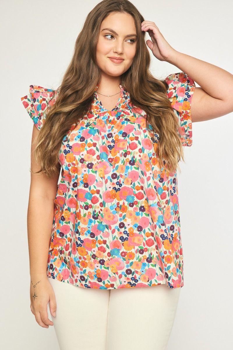 Floral print v-neck ruffle sleeve top featuring smocking at front and back.