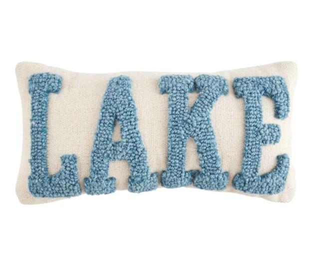 Relax after boat days with our Lake Mini Hook Pillow. The canvas pillow features a hooked wool applique. The pillow features the sentiment "LAKE' in the center in a lake inspired blue coloring. Pair this pillow with our other Lake Mini Hooked Pillow for a complete lake set!