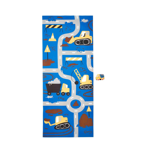 2-piece set. Foam, soft underfoot, construction site mat. Comes with plush dump truck toy. Vrommm... pull it back and watch it go!