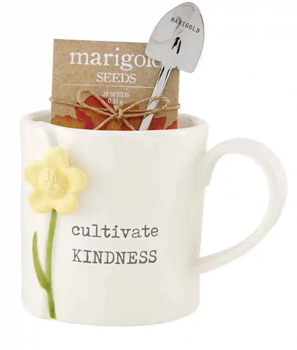 Bloom happy this Spring with our Cultivate Mug and Planting set. The three piece set comes with a hand-painted ceramic mug. The mug features a flower and the sentiment "cultivate kindness". The mug also comes with a shovel shaped metal soil marker and marigold seed packet.
