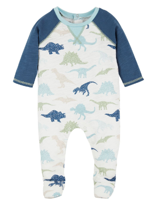 Cotton slub footed sleeper with raglan sleeves. Inner leg snaps.