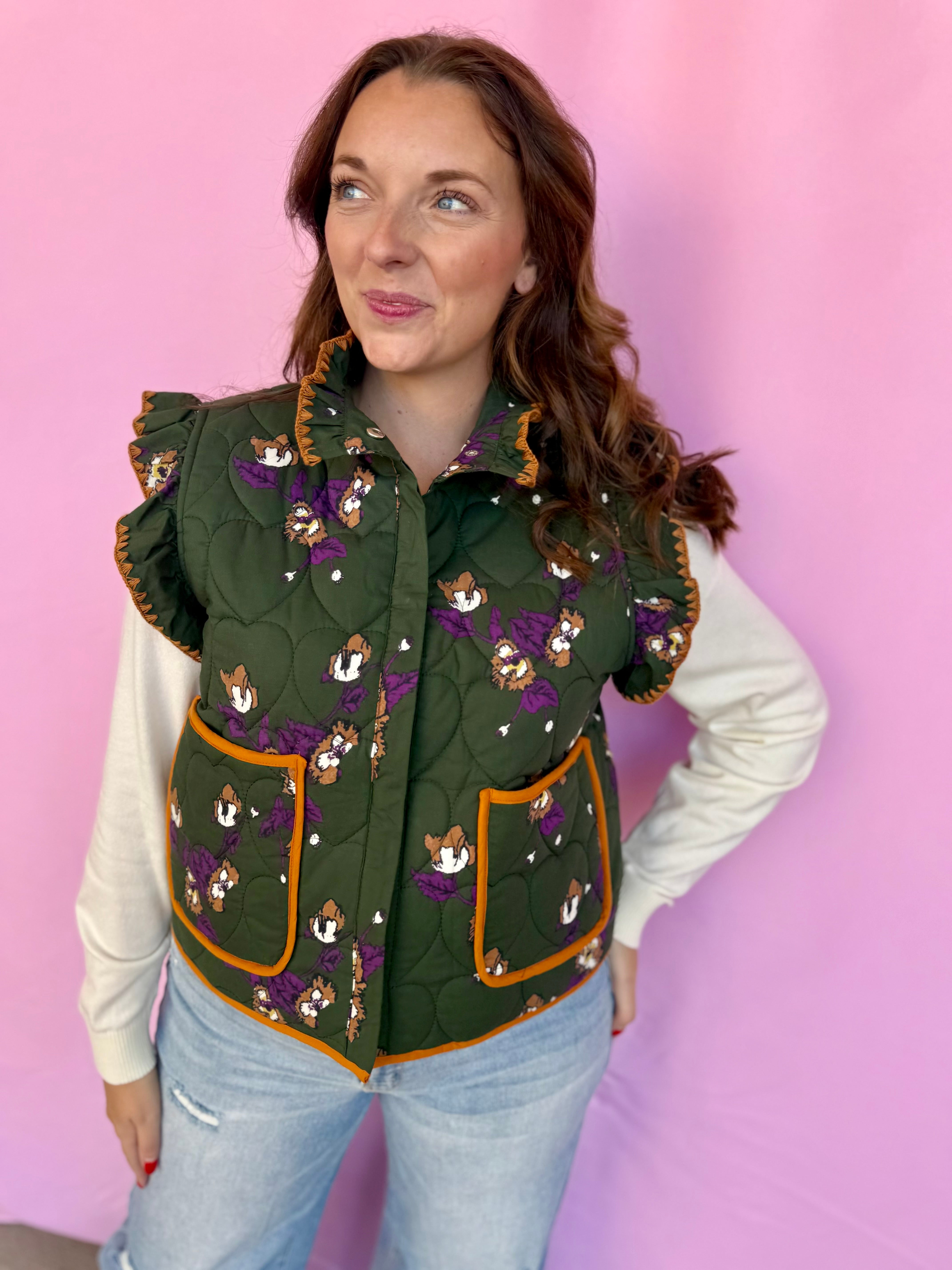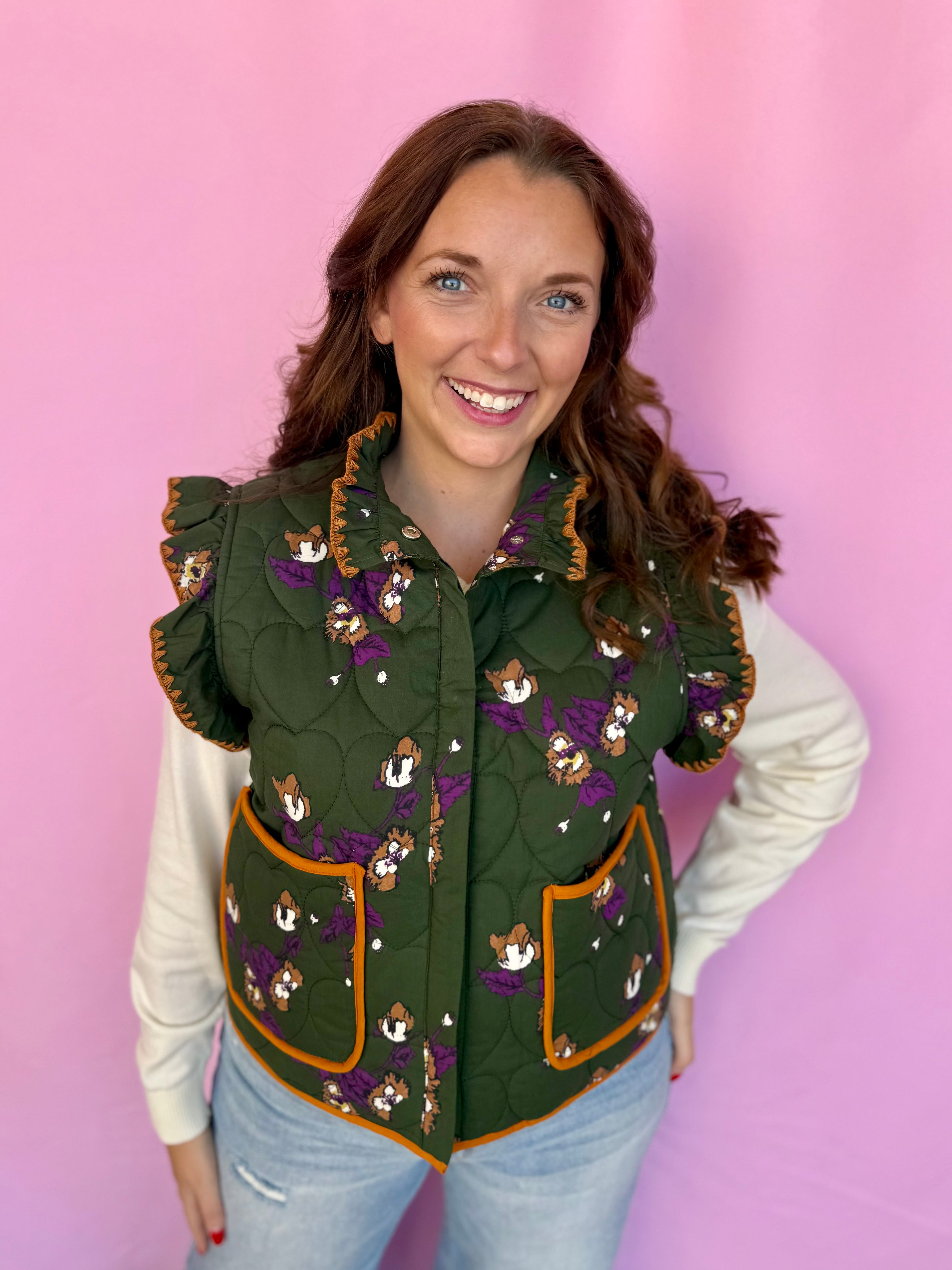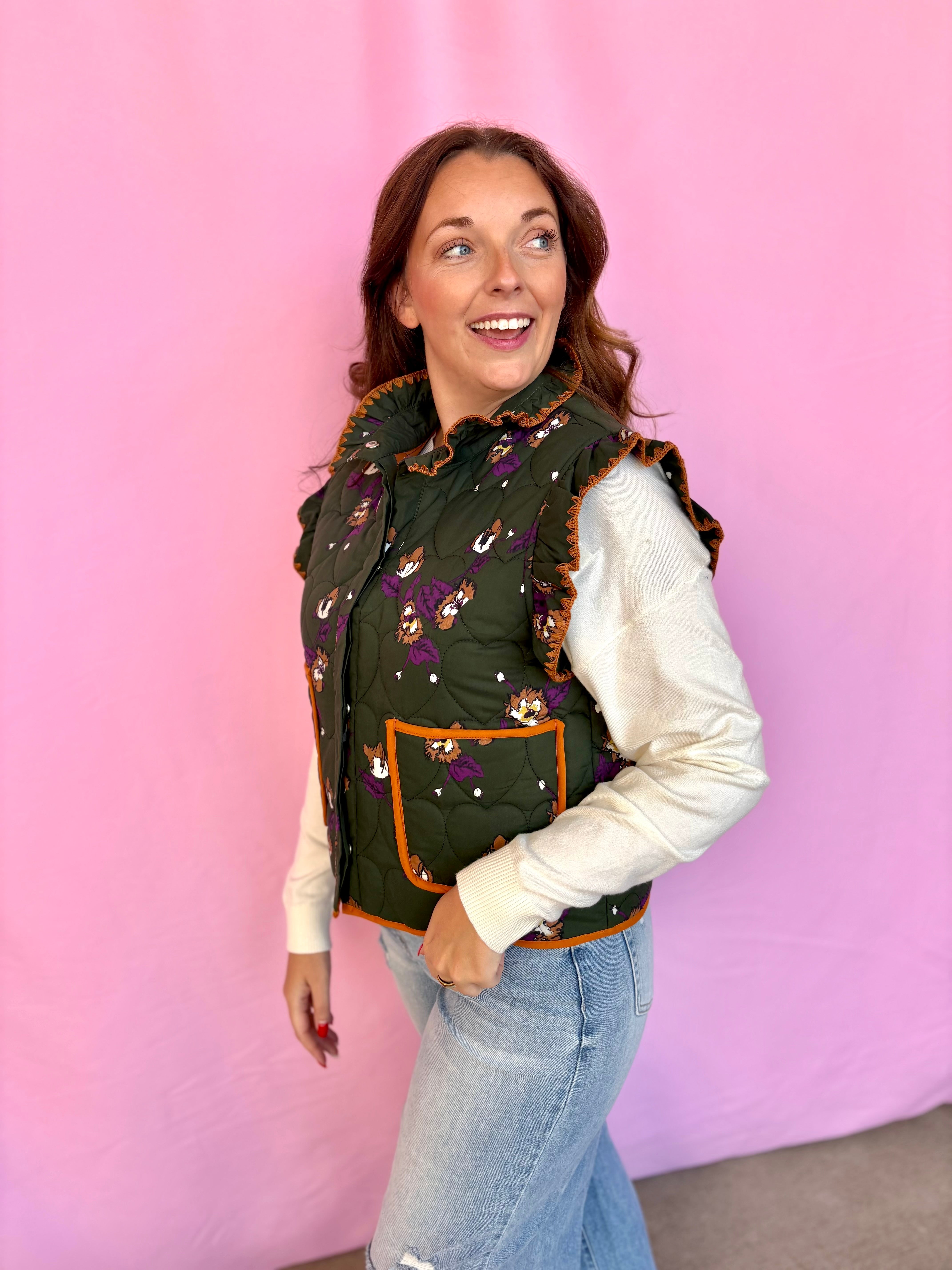 The Ease Your Mind Vest combines a playful olive green floral print with charming brown details for a sweet and bubbly look. Perfect for layering, it adds a cozy, colorful touch to any outfit, making your style feel fresh and effortlessly cheerful!