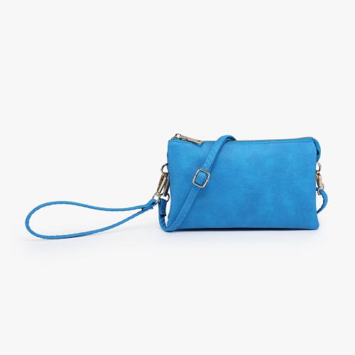 The Riley bag is one of our top sellers. This crossbody/clutch has two major compartments with one middle zipper pocket and a top zipper closure. Inside are two slip pockets and six cardholders. Wear it as a crossbody or use it as a clutch! Includes a detachable wristlet strap and an adjustable shoulder strap. Made of vegan leather. Dimensions: 8"L x 1.5"D x 5"H
