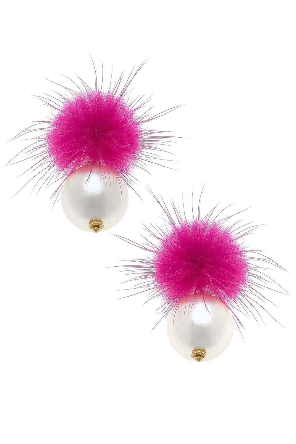 Elevate your look with these unique faux mink pompon and pearl drop earrings. Make a statement with these elegant and eye-catching fashion accessories.
