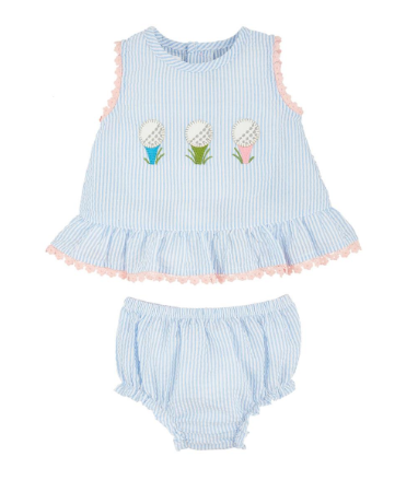 Appliqued seersucker pinafore features flounce hem and crochet trim. Comes with coordinating bloomers.