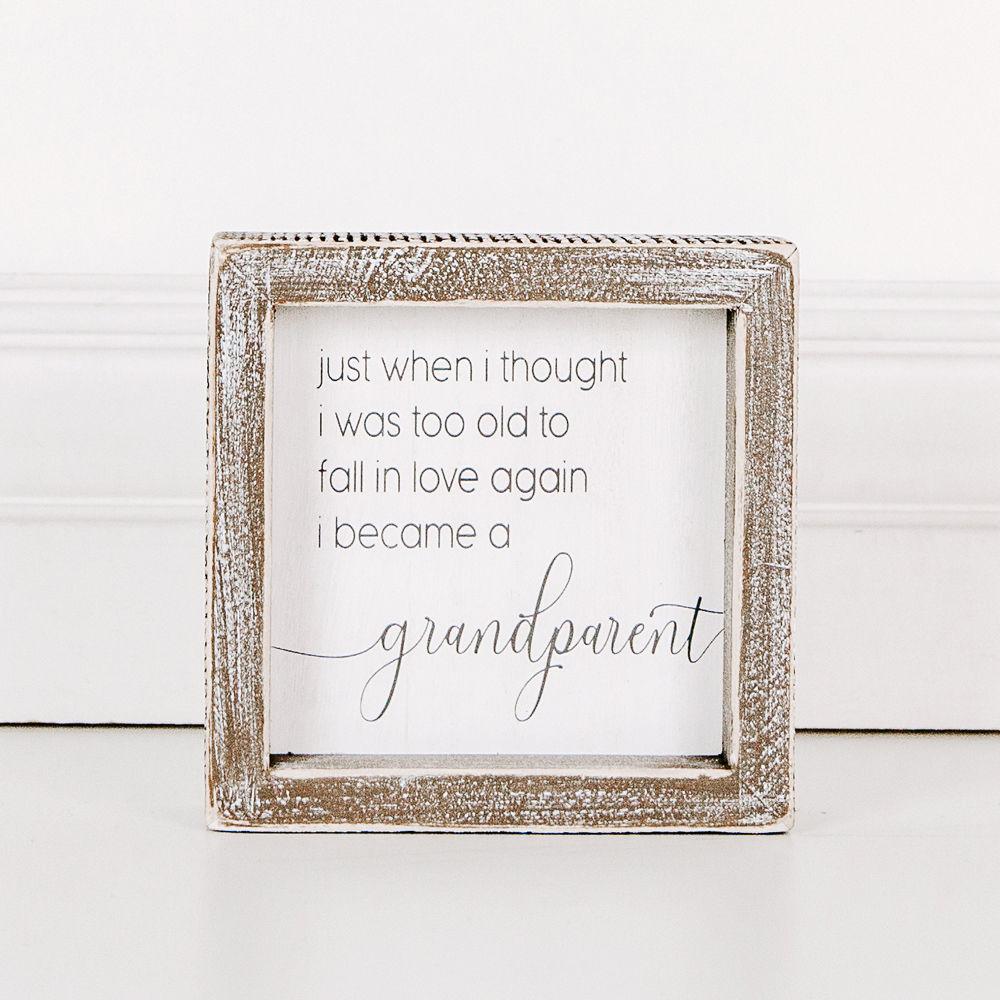 Spread an optimistic feel inside your home by hanging this wood sign! Displaying an inspiring message saying, "Just When I Thought I Was Too Old To Fall In Love Again I Became A Grandparent" adds a positive vibe in your home. It measures 5" by 5" by 1.5" and would look great either hanging or freestanding.