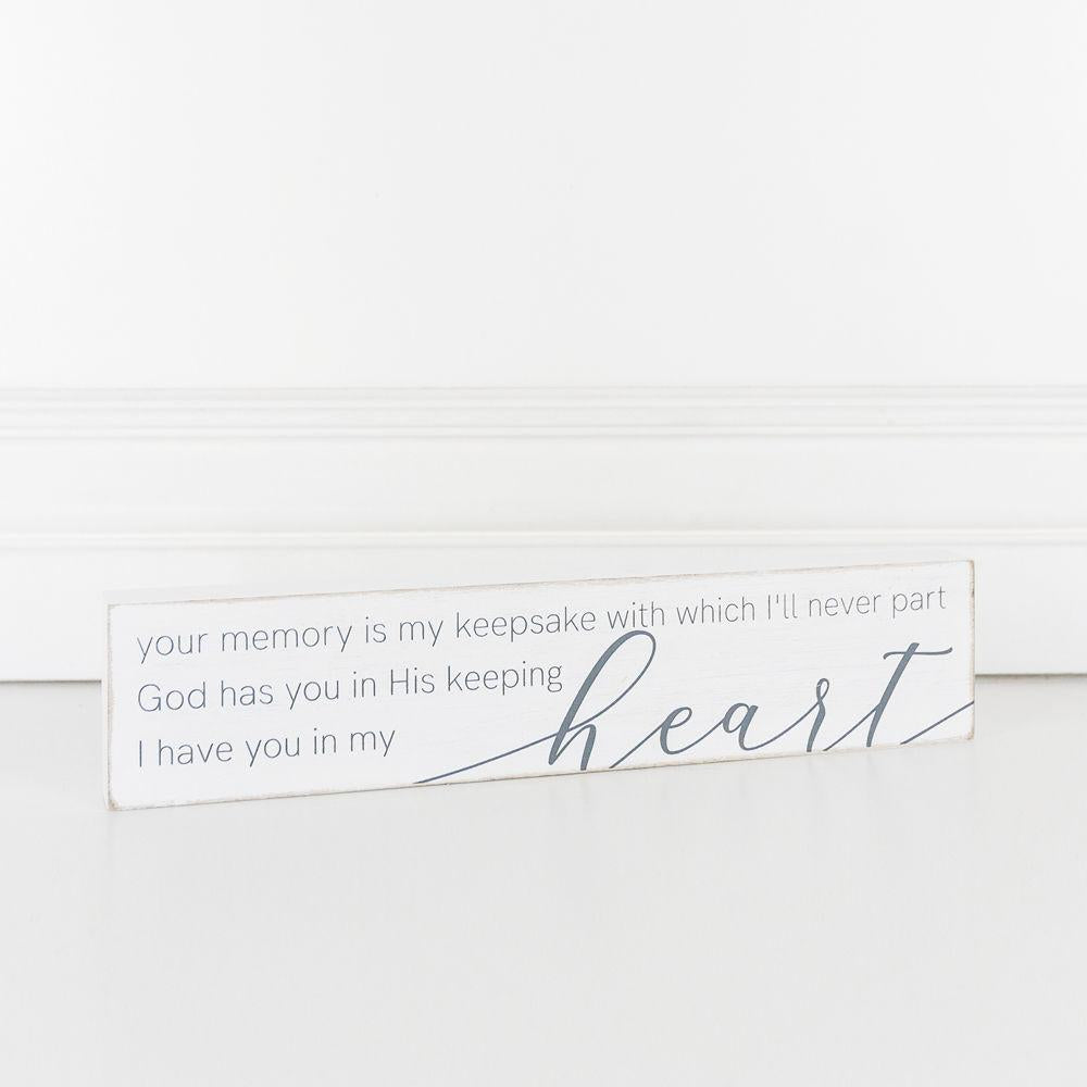 This decorative wood block uses a pretty combination of white and grey colors and displays, "Your Memory Is My Keepsake With Which I'll Never Part, God Has You in His Keeping, I Have You In My Heart" which makes it a good medium of expressing sympathy to a friend who has a departed loved one. It has dimensions of 12" by 2.5" by 1" and would look great sitting on your desk.