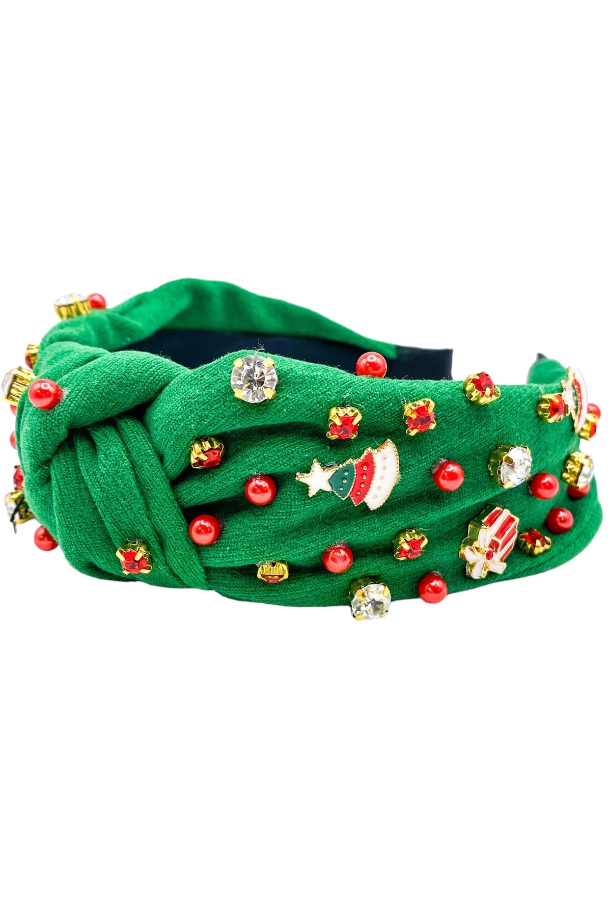 Deck your holiday look with the Christmas Eve Headband. This festive green headband is adorned with red beads and crystal gems, plus a festive Christmas tree and present charm. Make this unique accessory your go-to for any holiday party.