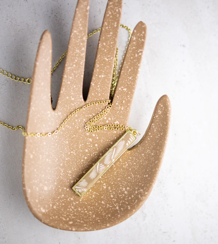 Double-sided handcrafted polymer clay inlays nestled within a frame bezel