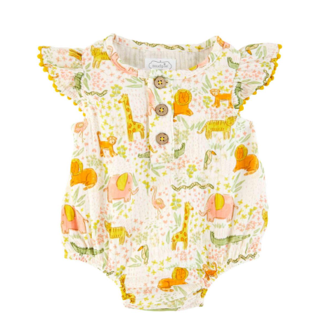 Cotton gauze bubble features flutter sleeves with pom trim and coconut wood button placket. Inner leg snap closure.