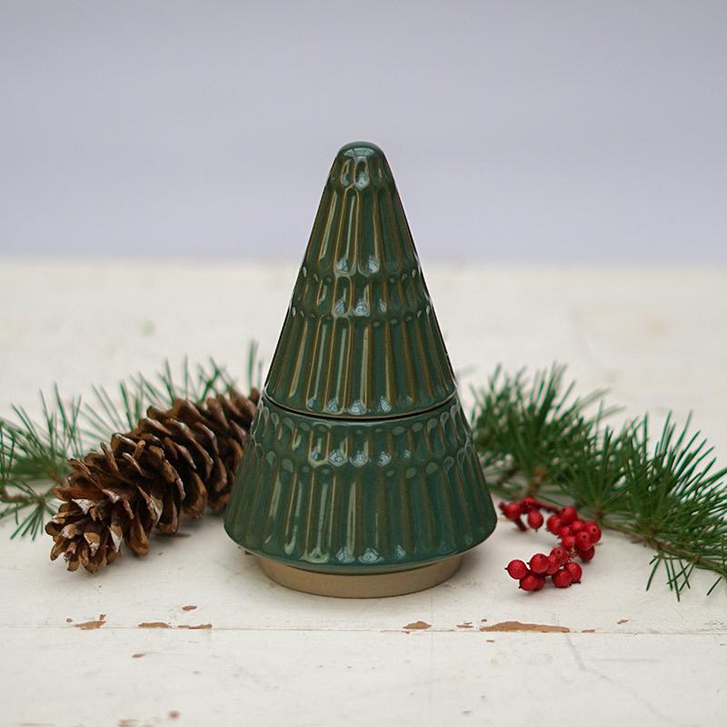 Delightful ceramic tree with stampled geometric shapes doubles as both a modern design and a holiday candle once the top is removed.