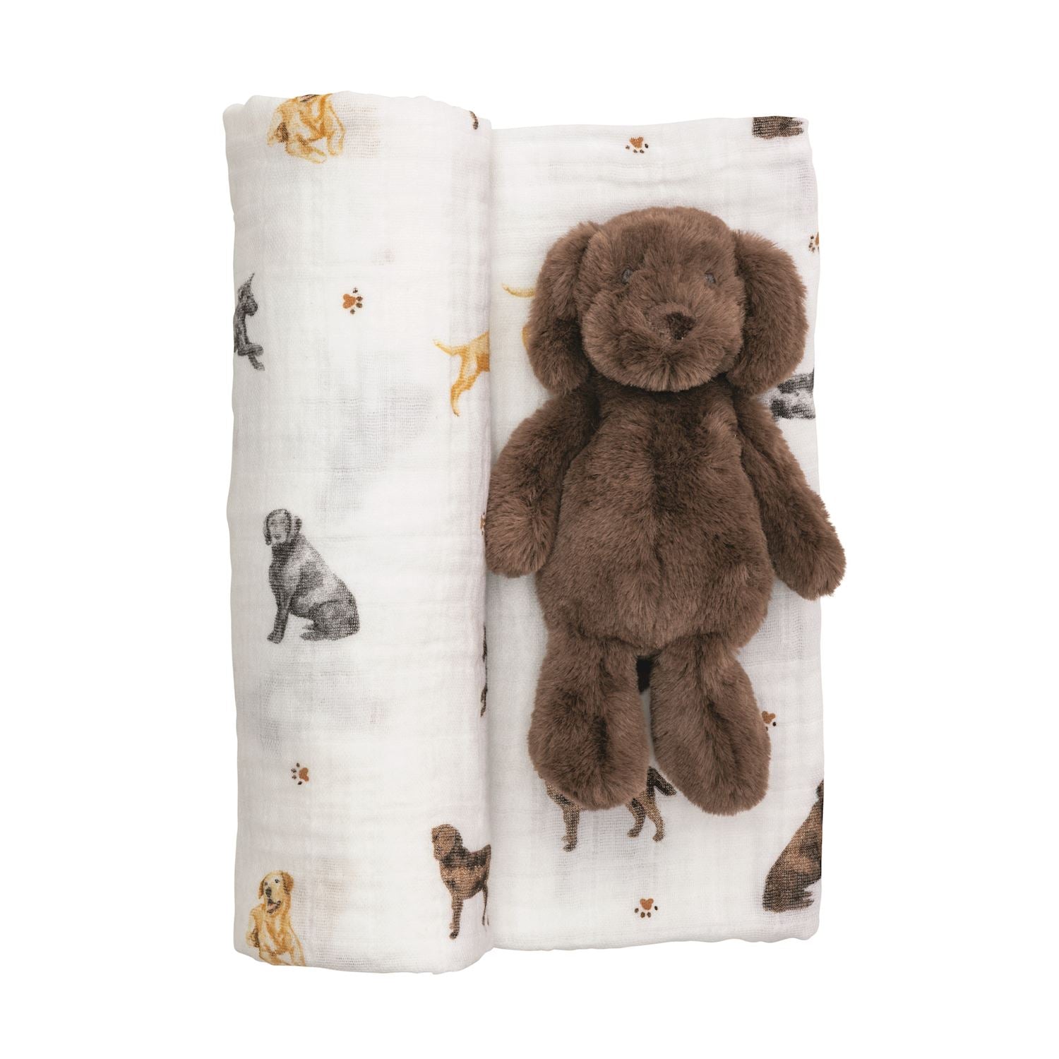 2-piece set. Muslin swaddle blanket comes rolled with coordinating faux fur plush rattle.
