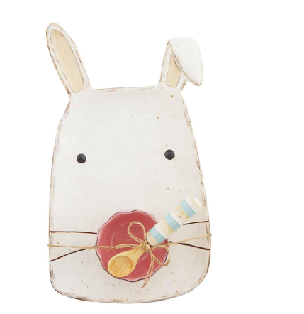 3-piece set. Hand-painted speckle stoneware bunny chip server. Comes with removable dip cup and stoneware and wood spoon.
