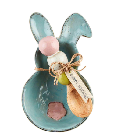 2-piece set. Hand-painted speckled stoneware bunny candy dish. Comes with coordinating stoneware and wood egg spoon.