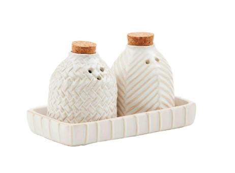 3-piece set. Reactive glaze stoneware salt and pepper shakers with textural surface detail and cork stoppers. Set comes with coordinating tray.