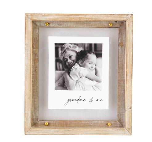 Paper matting pressed between glass panes holds 4" x 4" or 4" x 6" photo and features natural wood frame with brass thumb screw detail.
