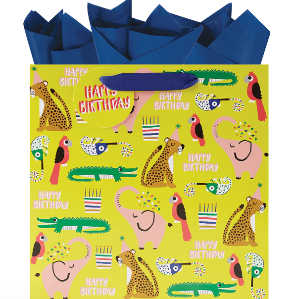 Printed on recycled white kraft, twill ribbon handles, 12.25" x 12.25" x 5"
