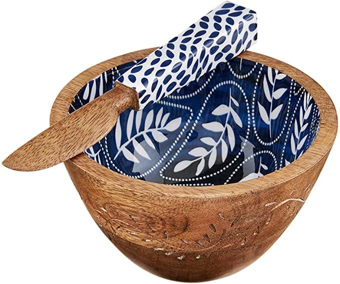2-piece set. Carved mango wood dip bowl with enamel patterned interior arrives with coordinating spreader.