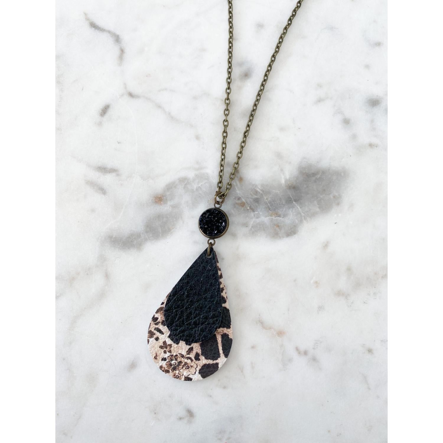 Black teardrop on a leopard sandy leather teardrop and 12mm black druzy on a 30 inch bronze oval link necklace.