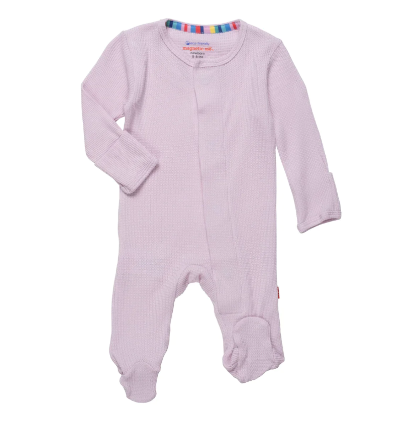 Soft light lilac waffle on our parent favorite footie is an everyday (and night) essential with magnetic closures that make dressing easy. magnets are quick, quiet, and a lifesaver for middle-of-the-night changes. eco-friendly TENCEL™ modal is silky soft, breathable, and gentle on sensitive skin.
