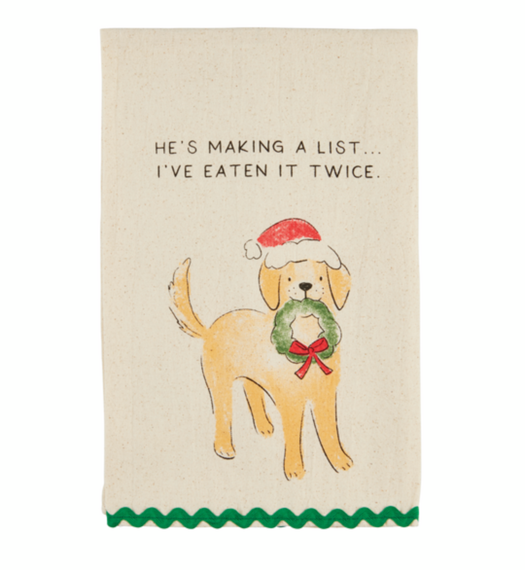 The He's Making A List Dog Ric-Rac Towel is a charming and practical addition to your kitchen or bathroom. This flour sack hand towel is made from high-quality canvas material, ensuring durability and long-lasting use. Measuring 26" x 16 1/2", it provides ample coverage for all your drying needs. What sets this towel apart is its delightful ric-rac trim. The intricate and playful design adds a touch of whimsy to your space, making it a perfect gift for dog lovers or anyone who appreciates unique and eye-catching decor. Not only is this towel aesthetically pleasing, but it is also highly functional. The flour sack material is known for its absorbency, making it ideal for drying dishes, hands, or any spills that may occur. Its soft and gentle texture ensures that it won't scratch delicate surfaces, making it safe to use on glassware or other sensitive items. Whether you choose to display it in your kitchen or bathroom, the He's Making A List Dog Ric-Rac Towel is sure to bring a smile to your face every time you use it. Its charming design and practicality make it a must-have accessory for any home.
