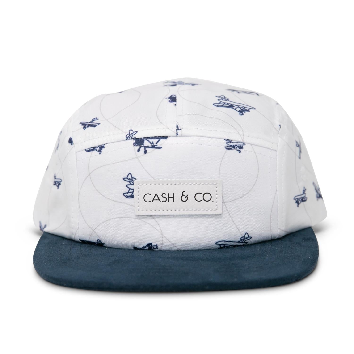 Fabric - 60% Polyester 40% Cotton. White hat with navy blue plane print. White leather logo patch. Navy suede brim with navy plastic strap.