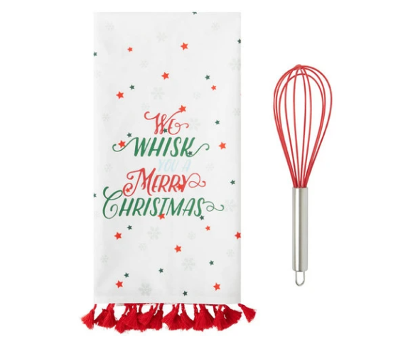 Christmas Kitchen Gift Set includes one cotton tea towel with screen printed design and red fringe border. Comes packaged with silicone whisk. Perfect for holiday gifting with ribbon tie!
