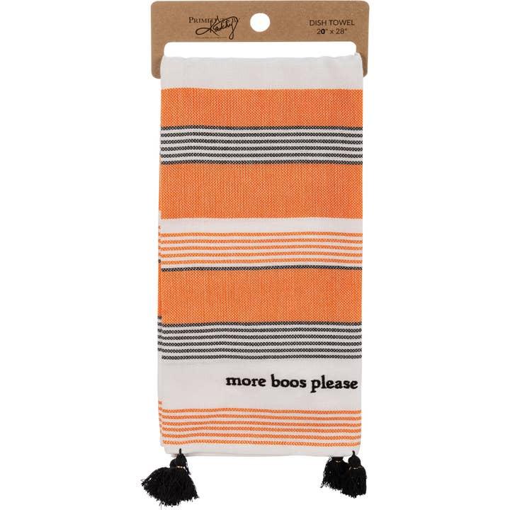 A cotton kitchen towel from our Halloween Collection features a Halloween-inspired color palette with embroidered "More Boos Please" sentiment and woven stripe designs. Includes tassel accents for added interest.