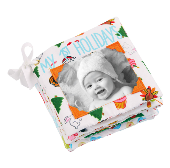 Capture pictures and memories of baby's first holidays in this cloth book for both of you to look back on. Record baby's holiday favorites and slip a photo in each sleeve of this soft book. The pages untie so they can be rearranged in chronological order depending on baby's birth date. Makes a perfect gift for a baby shower or newborn.
