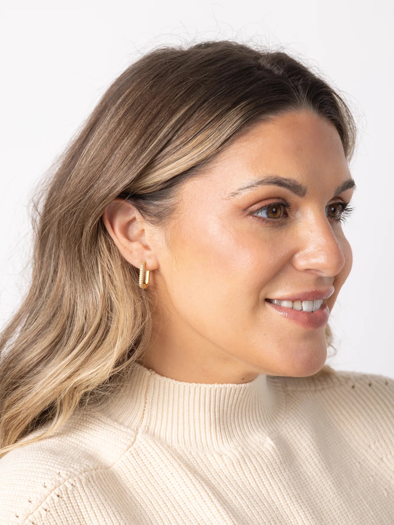 These stylish earrings beautifully combine the classic huggie design with a sleek hoop silhouette, creating a versatile piece that can be worn every day or for a special occasion. Crafted with delicate gold detailing and stunning glass tones, they offer a modern twist on timeless elegance.