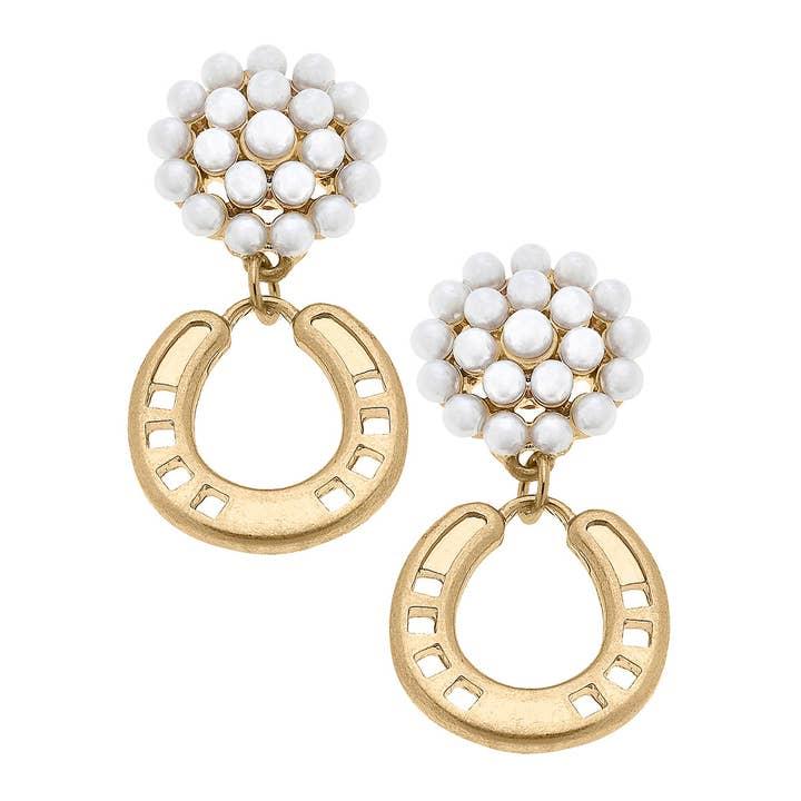 These unique earrings feature a delicate cluster of pearls and a horseshoe design, perfect for Derby season or any occasion. Make a statement with these elegant and versatile earrings.