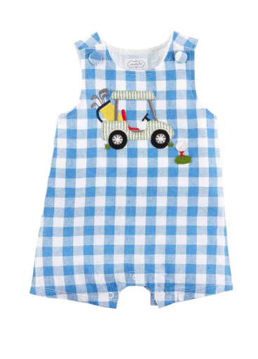 Appliquéd gingham Jon Jon features covered button shoulders and inner leg snap closure.