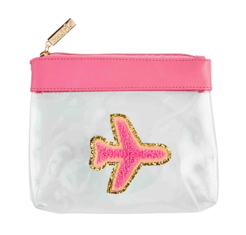 Clear vinyl zipper case features bright icon patch and faux leather trim.