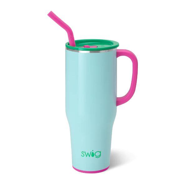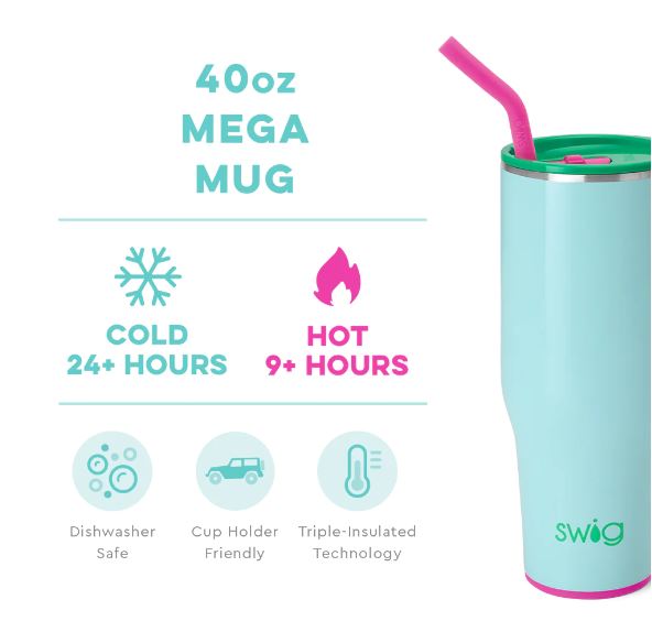 Hydrating has never been easier with our 40oz Mega Mug! The cup holder friendly frame, comfort-grip handle and flexi-straw come together to create their new favorite Swig!