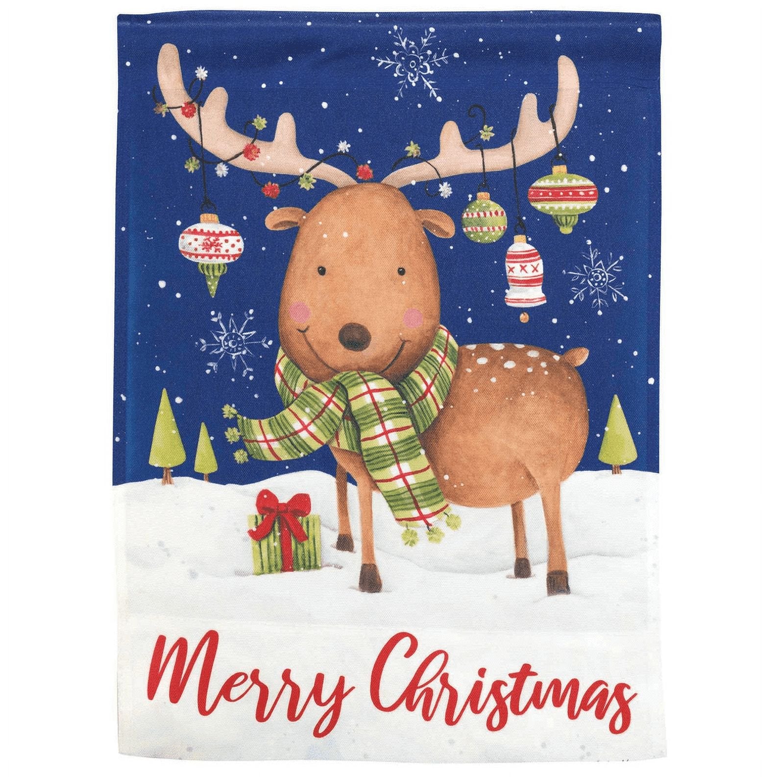 Reindeer Merry Christmas Print Garden Flag Get into the Christmas spirit with this Reindeer flag Garden size Print flag Design is sublimated to become part of the fabric not just printed on the surface Of heavy duty 650 denier polyester this flag offers outstanding quality at an affordable price Flag is single thickness design is the same front and back Light shining through from behind creates a stained glass effect Flag will retain its color and beauty for years if displayed in shade or semi shade and is rainproof Flagpole not included Specifications .