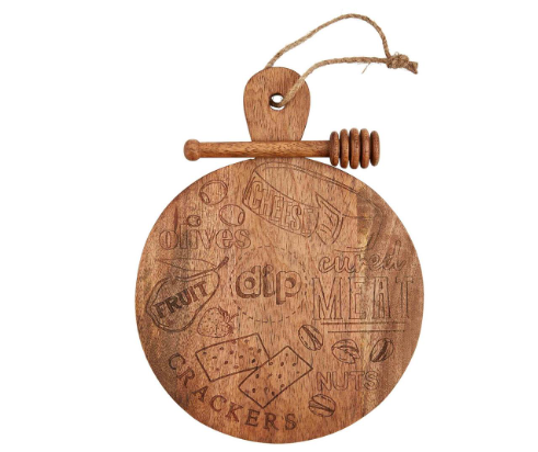 2-piece set. Engraved mango wood paddle board. Comes with honey dipper.