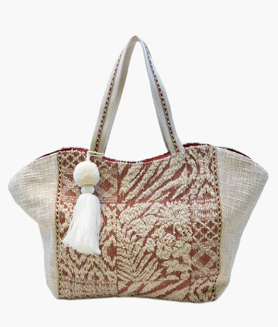 This is a uniquely-shaped tote that features a contrast print and a large tassel. This handwoven, cotton style is lined with slip and zip pockets.