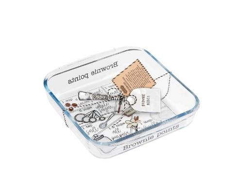 2-piece set. Glass brownie recipe guide baking dish. Comes with silverplate spatula.