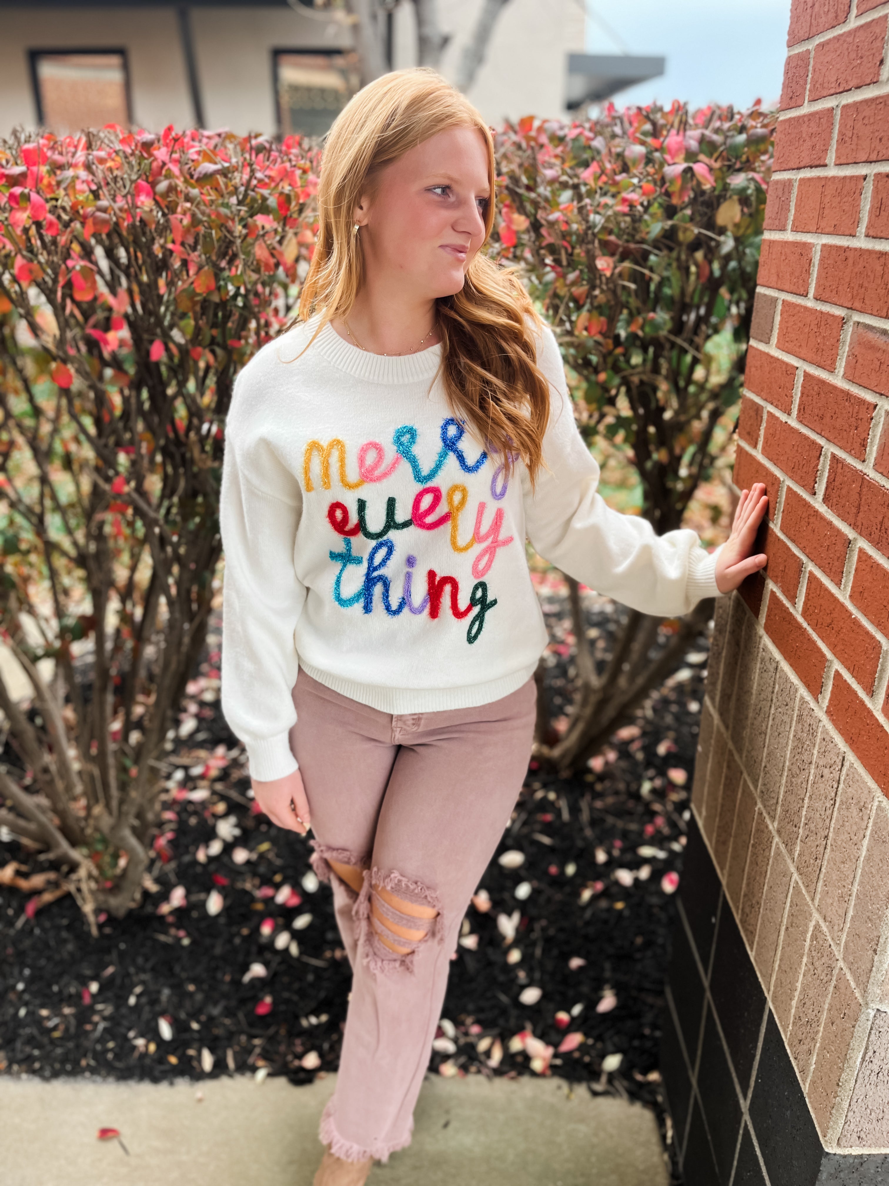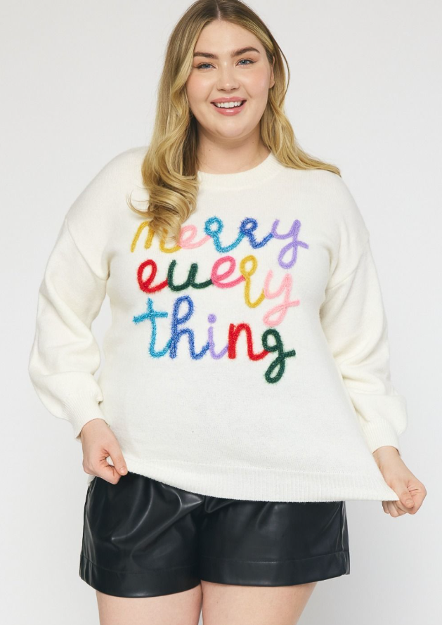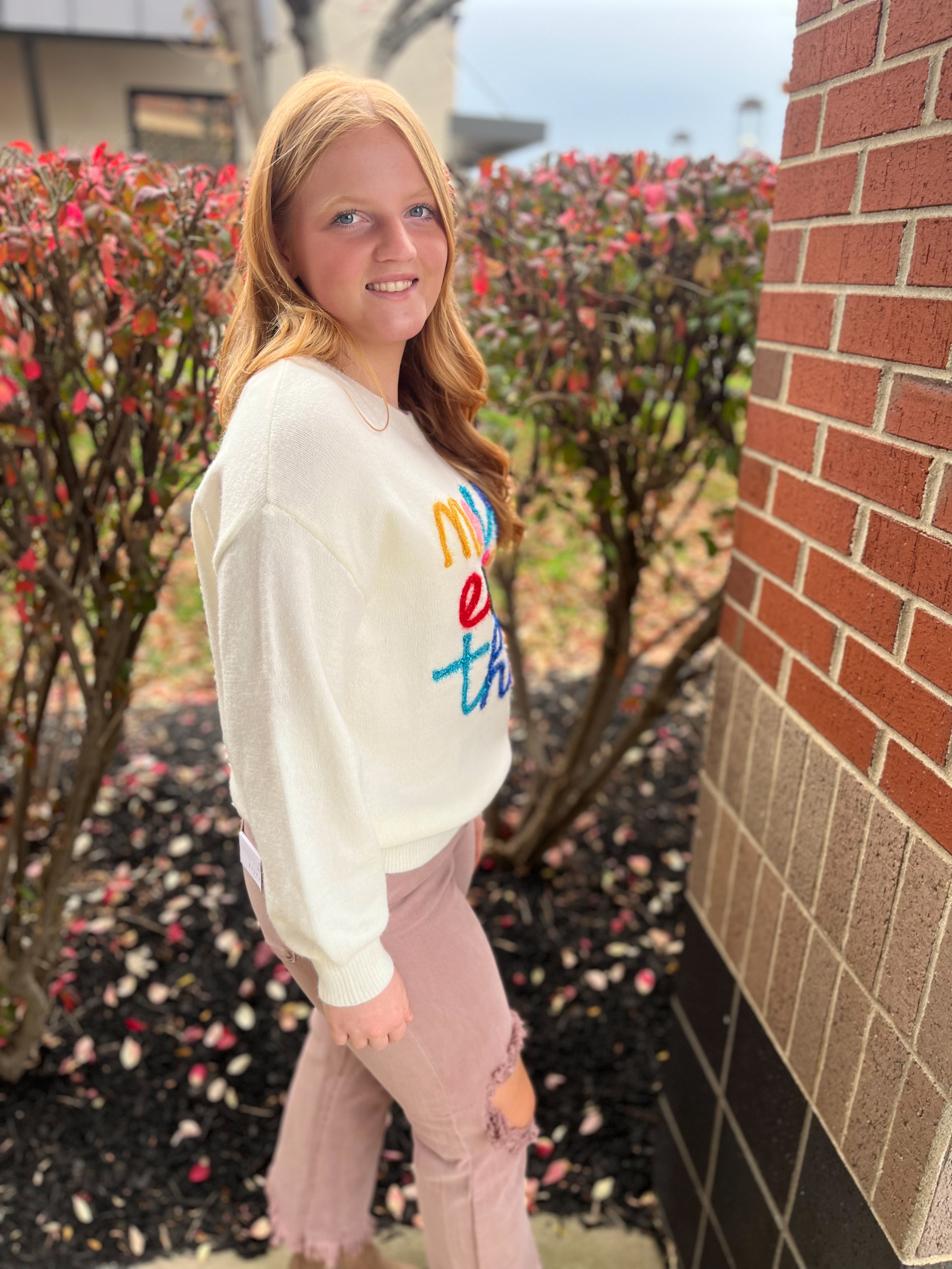 Round neck fuzzy knit sweater featuring letter trimming detail.
